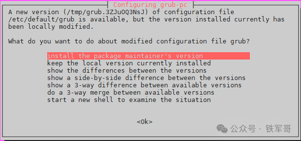 grub-pc配置文件冲突,新安装的版本更新,选择install the package maintainer's version来安装软件包维护者版本。