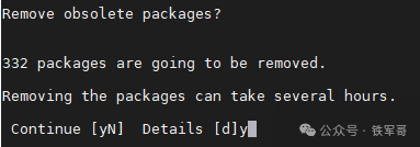 提示删除过时的软件包,如果继续,将删除331个软件包,说是要几个小时,其实几分钟就好了。