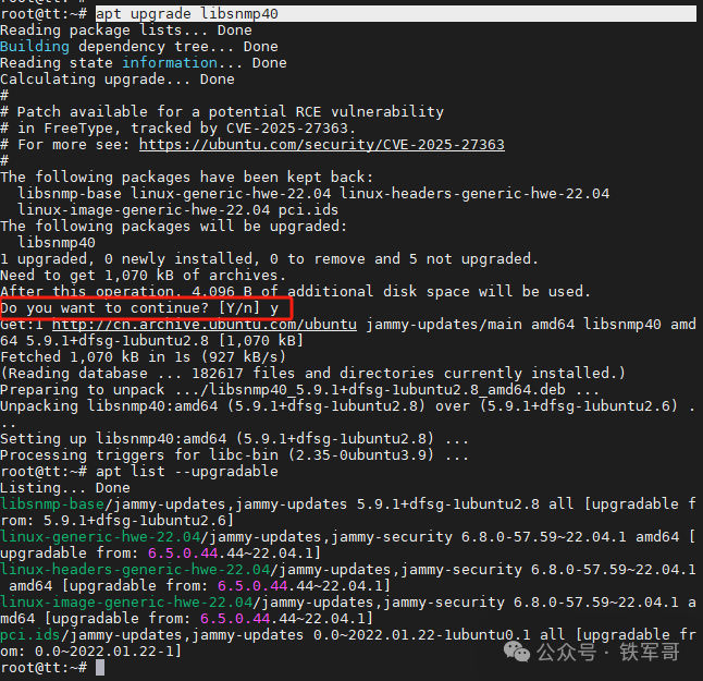 升级完成之后,需要输入y重启系统完成更新。