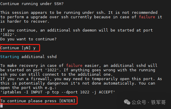 当通过SSH登录进行操作时,会有一个额外的提示,提醒为避免出现意外,会增加一个额外的1022监听端口;输入y之后,还要再按一次回车才能继续。