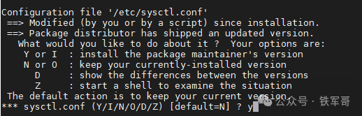大约过了一个小时,提示配置/etc/sysctl.conf,输入y继续升级。