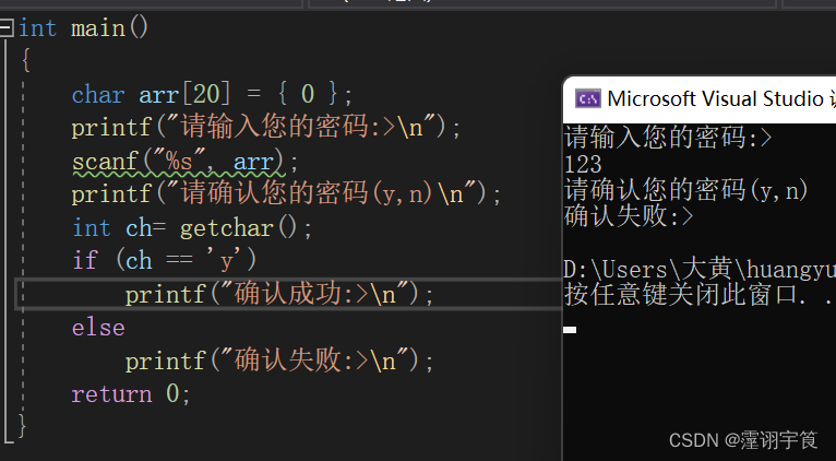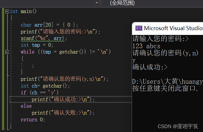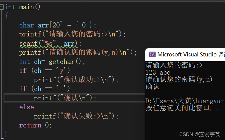 printf("请确认您的密码(y,n)\n");//流程:键盘:123回车------>小黑屏:123\n------->缓冲区:123\n----->scanf带走的:123(现在缓冲区里还有\n)