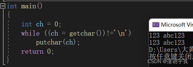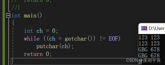 while ((ch = getchar()) != EOF)//这里的EOF有两种情况1.读取错误2.文件结束,为了避免因为这两种情况的出现,而被putchar输出EOF。所以在while(判断部分)不等于EOF,那么EOF就不会进入while,继而被putchar输出。
