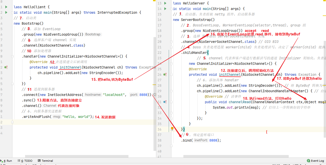 - 8 处,消息会经过通道 handler 处理,这里是将 String => ByteBuf 发出