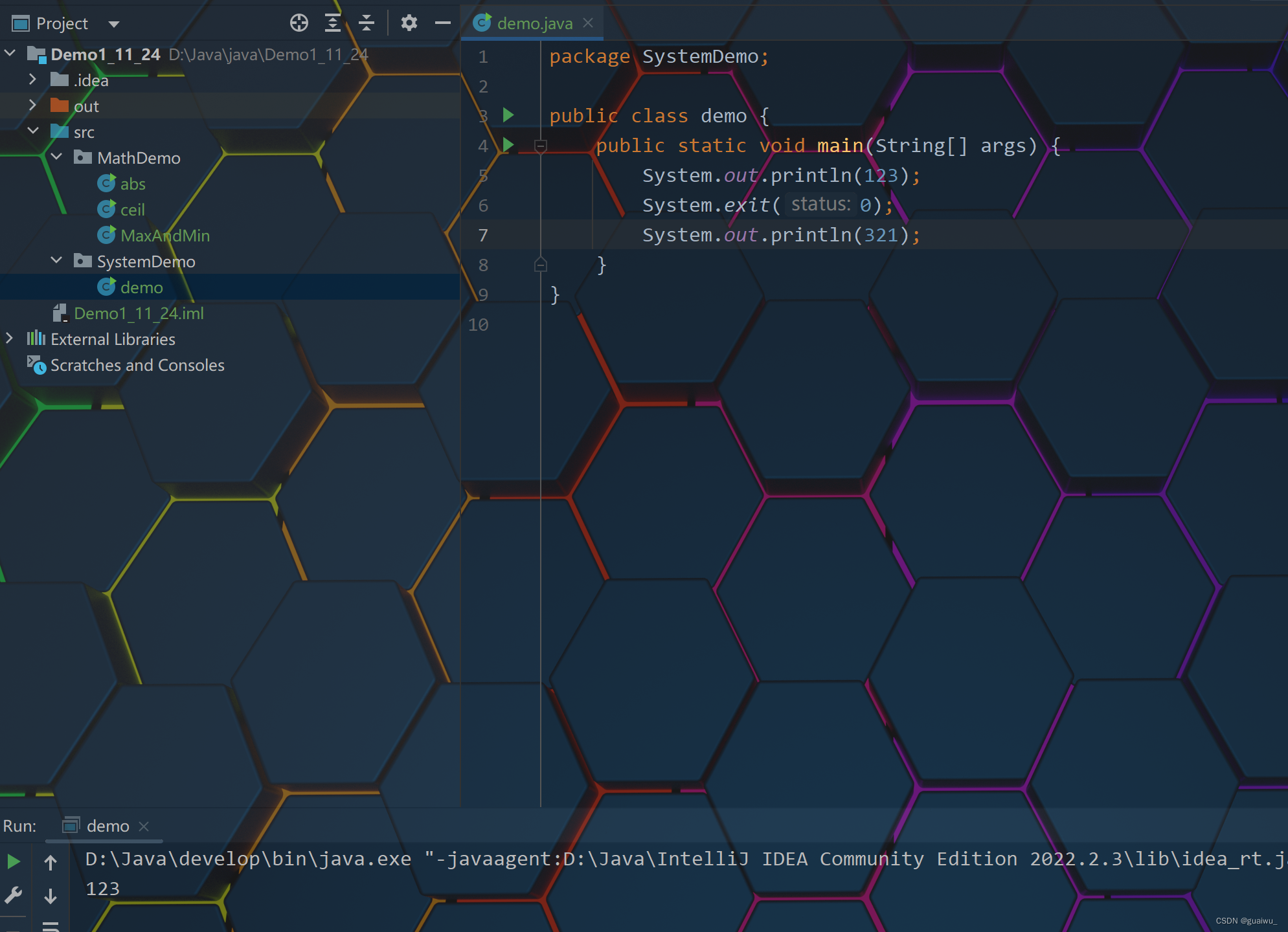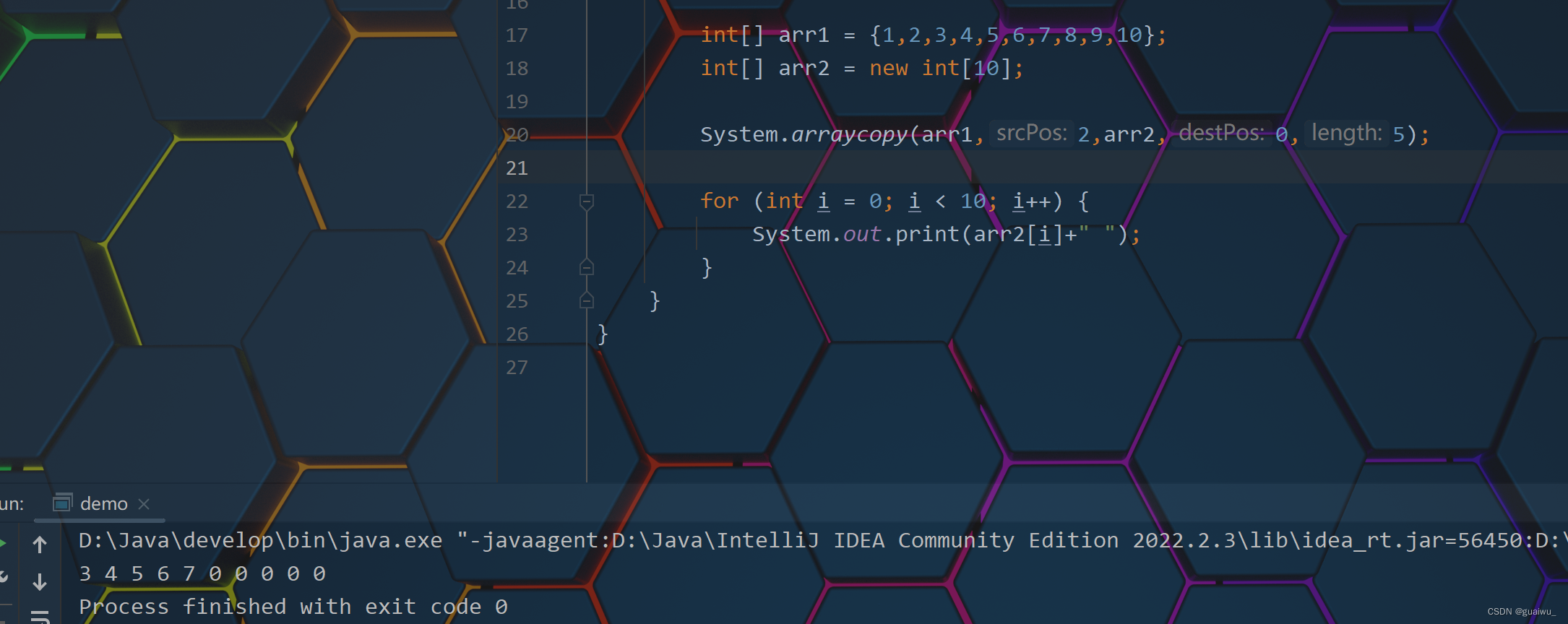 public static void arraycopy(数据源数组,起始索引,目的地数组,起始索引,拷贝个数) 作用:拷贝数组(1)System.exit()的使用