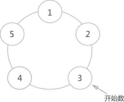 如下图所示,假设此时圆周周围有 5 个人,要求从编号为 3 的人开始顺时针数数,数到 2 的那个人出列: