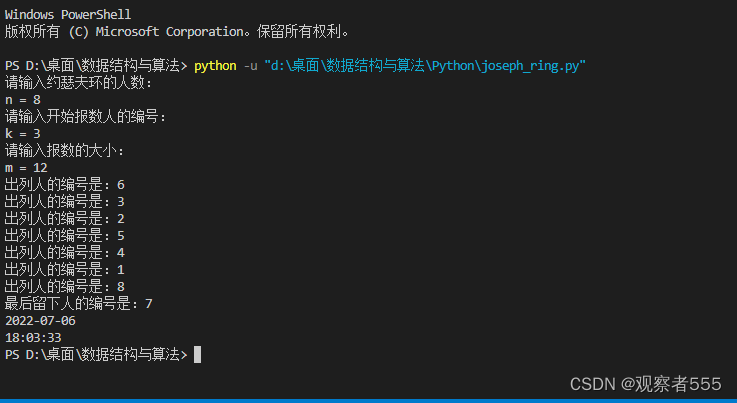 - 4 出列后,从 5 开始数 1,1 数 2,所以 1 出列;