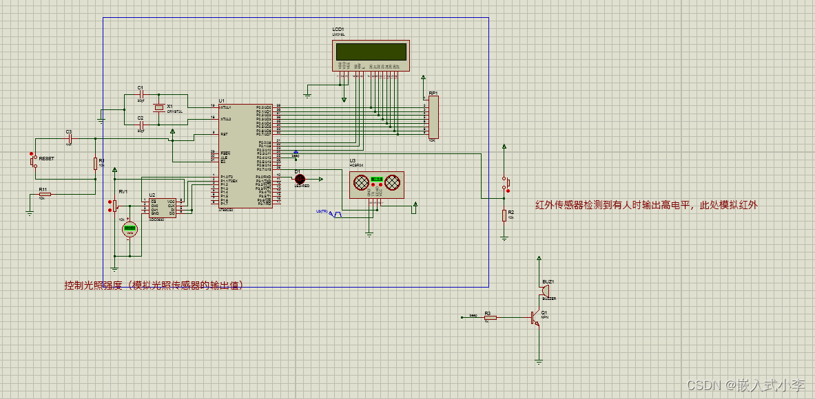 仿真时,光照强度用滑动变阻器+ADC0832模拟,红外热释电则通过一个按键来模拟。(代码及仿真文件等相关工程,放在了文章最后)