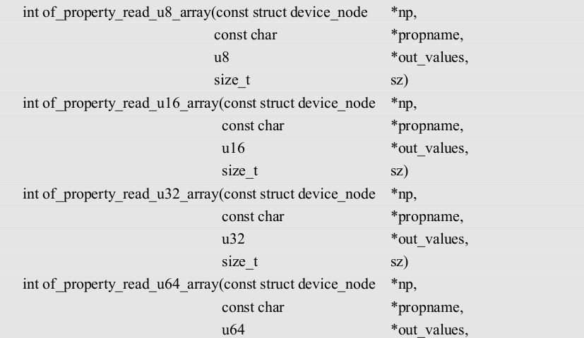 这 4 个函数分别是读取属性中 u8、u16、u32 和 u64 类型的数组数据,比如大多数的 reg 属性都是数组数据,可以使用这 4 个函数一次读取出 reg 属性中的所有数据。这四个函数的原型如下: