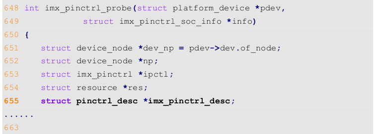 第 655 行,定义结构体指针变量 imx_pinctrl_desc。