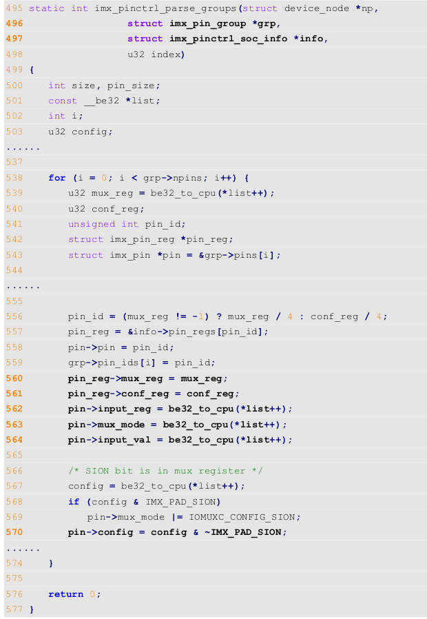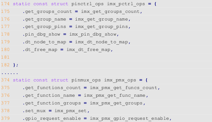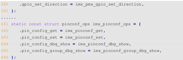 imx_pctrl_ops、imx_pmx_ops 和 imx_pinconf_ops 这三个结构体定义如下: