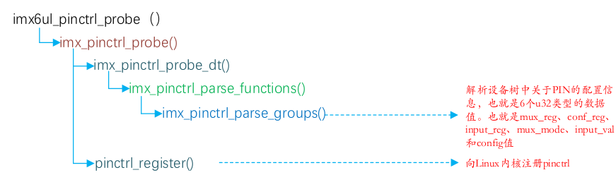 第 347~355 行,platform_driver 是平台设备驱动,这platform_driver 是个结构体,有个 probe 成员变量。当设备和驱动匹配成功以后 platform_driver 的 probe 成员变量所代表的函数就会执行,在 353 行设置 probe 成员变量为 imx6ul_pinctrl_probe 函数,因此在本实验中 imx6ul_pinctrl_probe 这个函数就会执行,可以认为 imx6ul_pinctrl_probe 函数就是 I.MX6ULL 这个 SOC 的 PIN 配置入口函数。以此为入口,如图 所示的函数调用路径: