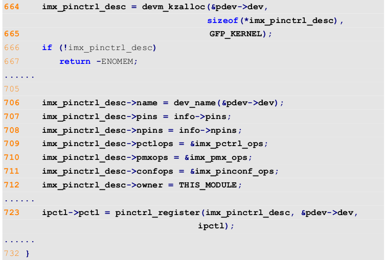 第 723 行,调用函数 pinctrl_register 向 Linux 内核注册 imx_pinctrl_desc,注册以后 Linux 内核就有了对 I.MX6ULL 的 PIN 进行配置的工具。