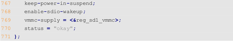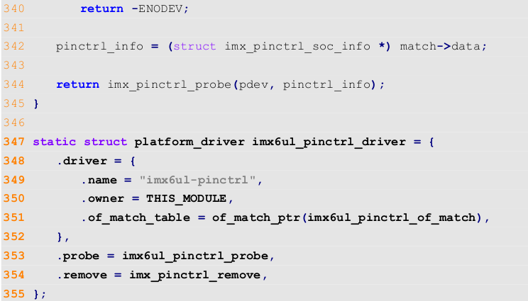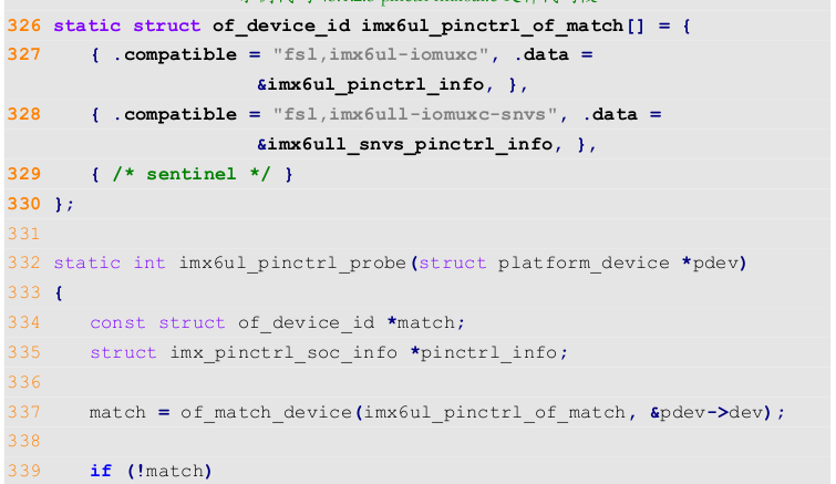 第 326~330 行,of_device_id 结构体数组,里面保存着这个驱动文件的兼容性值,设备树中的 compatible 属性值会和 of_device_id 中的所有兼容性字符串比较,查看是否可以使用此驱动。