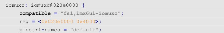 compatible 属性值为“fsl,imx6ul-iomuxc”,Linux 内核会根据 compatbile 属性值来查找对应的驱动文件