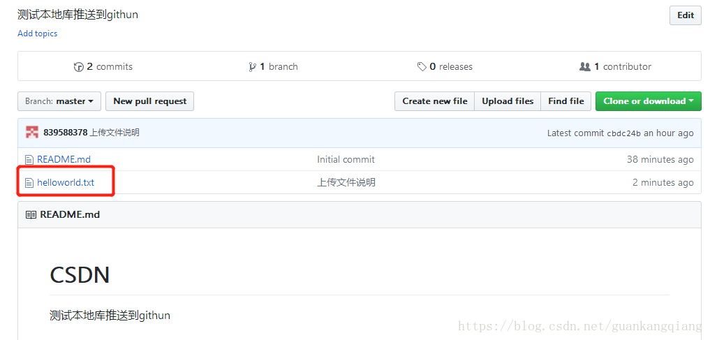 7、去到GitHub上绵看下你的文件,多了helloworld.txt,完成