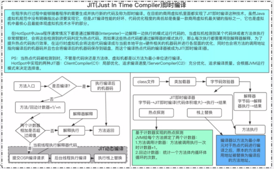 - 第二种是即时编译(Just-In-Time compilation,JIT),即将一个方法中包含的所有字节码编译成机器码后再执行。