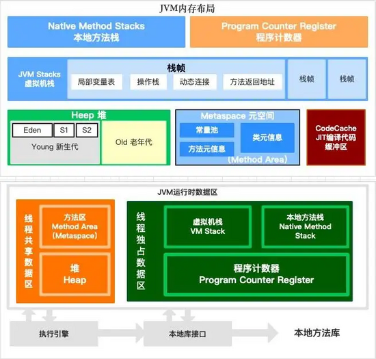 不同的是,Java 虚拟机会将栈细分为面向 Java 方法的 Java 方法栈,面向本地方法(用 C++ 写的 native 方法)的本地方法栈,以及存放各个线程执行位置的 PC 寄存器。