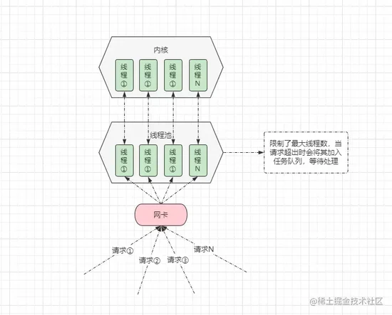 在 BIO 这种模型中,为了支持并发请求,通常情况下会采用“请求:线程” 1:1 的模型,那此时会带来很大的弊端: