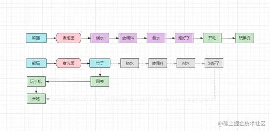 在这个栗子中,第一种情况就属于同步执行的,每一个步骤都需要建立在上一个步骤的基础上依次进行,一步一步全部做完了才能吃上泡面,最后玩手机。而第二种情况则属于异步执行的,熊猫主要煮泡面时,只需要告诉竹子后就能立马回去玩手机了,其他的一系列工作都会由竹子完成,最后熊猫也能吃上泡面。