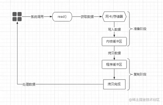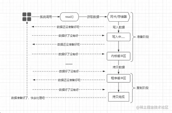 当程序中需要进行 IO 操作时,会先调用内核提供的 read() 函数,但在之前分析过 IO 的工作原理, IO 会经过“设备→内核缓冲区→程序缓冲区”这个过程,该过程必然是耗时的,在同步阻塞模型中,程序中的线程发起 IO 调用后,会一直挂起等待,直至数据成功拷贝至程序缓冲区才会继续往下执行。
