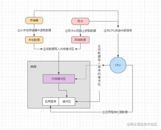 CPU将内核中的数据写入到对应的程序缓冲区或网络Socket接收缓冲区中。 - ⑤数据全部写入到缓冲区后,应用程序开始对数据开始实际的处理。