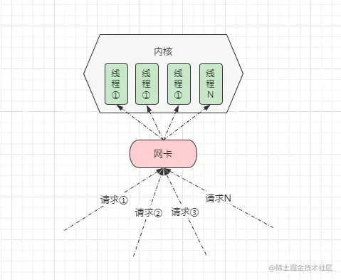 很简单,采用多线程实现,包括最初的 IO 模型也的确是这样实现的,也就是当出现一个新的 IO 调用时,服务器就会多一条线程去处理,因此会出现如下情况: