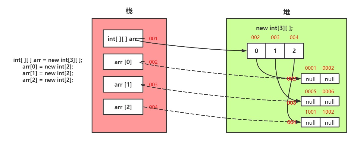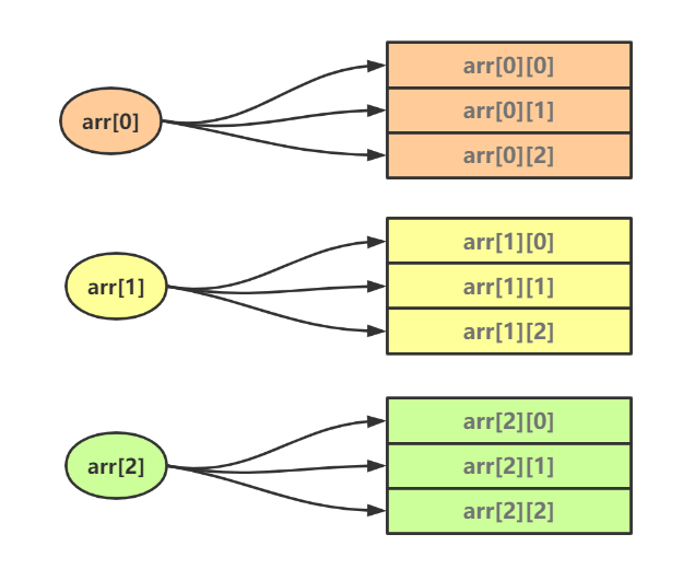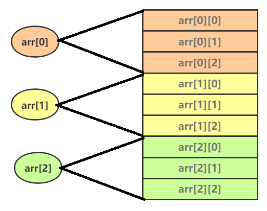 如图,上面的例子是这样表示的。在堆内存中,各个一维数组的元素是连续的,但各个一维数组之间不是连续存放的。