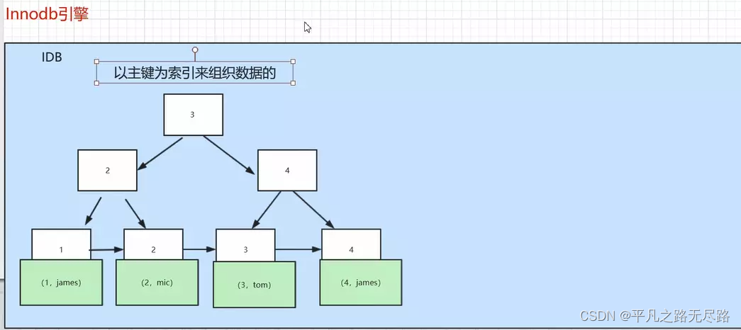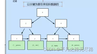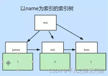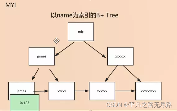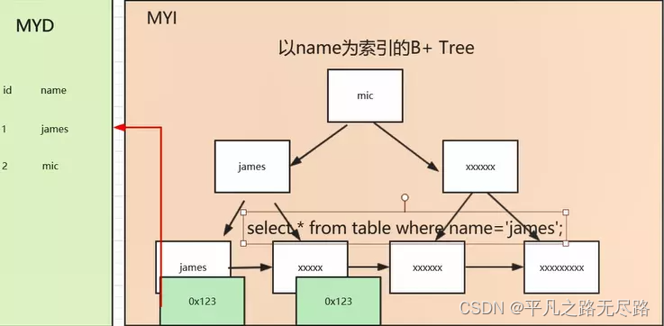 查询时,去看name是不是索引,如果是,就去找到james所在的主键,然后就去我们的树上这里面找到主键对应的数据。