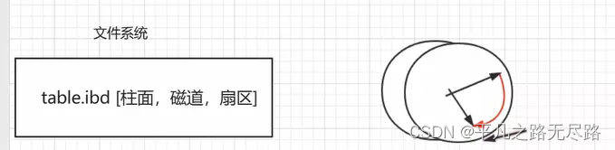 我们的数据库表就是在ibd文件格式中的,当我们查询数据库时,就是去通过IO 流获取本地文件,通过柱面,磁道,扇面三个维度来找到我们要查询的数据,比如右边红色就代表我们的table.ibd表,当开始读时,就去扫描这个表获取数据。