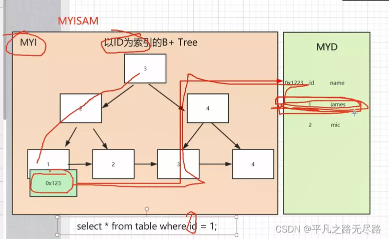 当执行上面查询的时候,查询过程就是先判断MYI里面是否有,基于ID建立的索引,如果找到了,他就会根据从开始节点开始找,然后找到1这个叶子节点,就找到了。然后根据key对应的地址,去表中找ID等于1的数据。这个就是检索的过程。