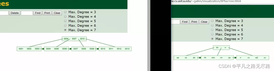 B+tree的区别就是:不是每个节点都会存储数据的,他的数据会存储在我们的叶子节点上,