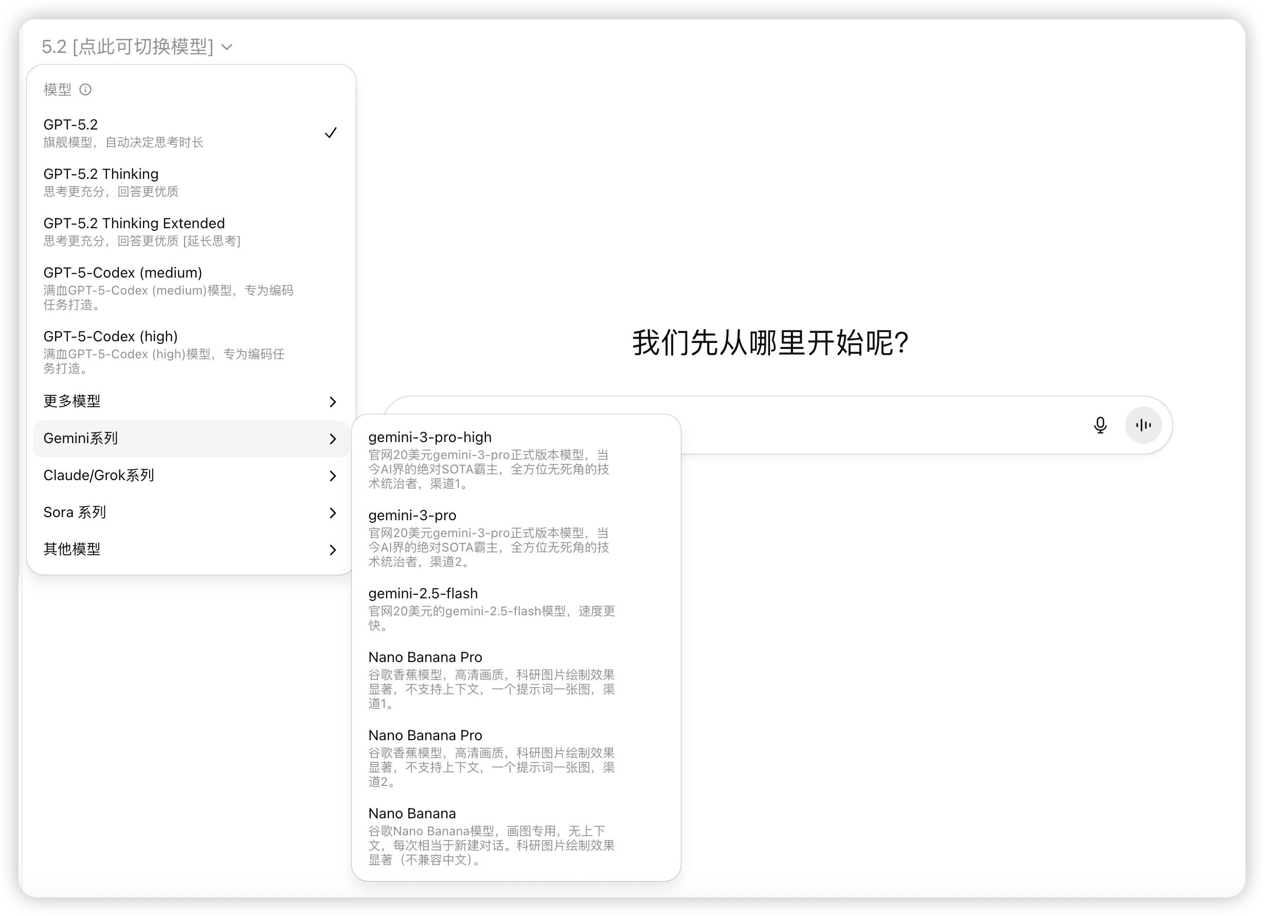 包含GPT-5.2、GPT-5.2 Thinking、GPT Image 1.5、Gemini 3 Pro、Nano Banana Pro、Claude Sonnet 4.5、Codex、Sora2、Grok4.1等模型。