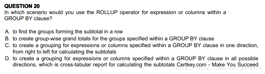 答案C看到一个right toleft(从右到左),因为rollup(a,b,c)是按照这顺序的先group by a,b,c然后a,b,然后a,然后不分组,从右到左4个结果unionall。