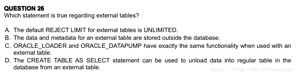 这道题目的知识点是要你熟悉外部表,怎么建外部表,外部表的数据是怎么存储的等等。请给出正确答案,并解释A B C D每项,最好用实验测试证明!