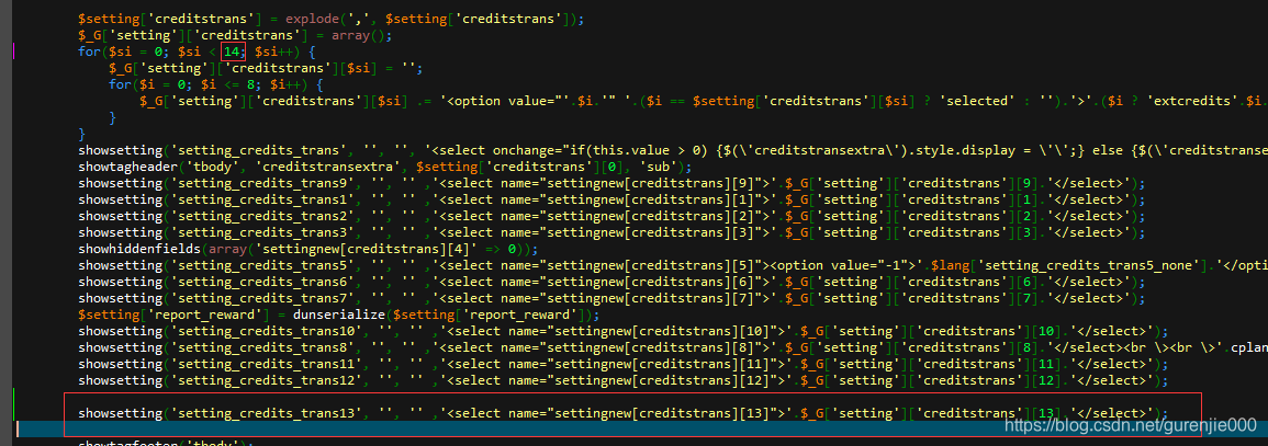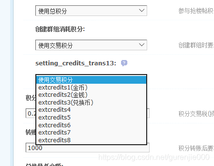 showsetting('setting_credits_trans13', '', '' ,'<select name="settingnew[creditstrans][13]">'.$_G['setting']['creditstrans'][13].'</select>');