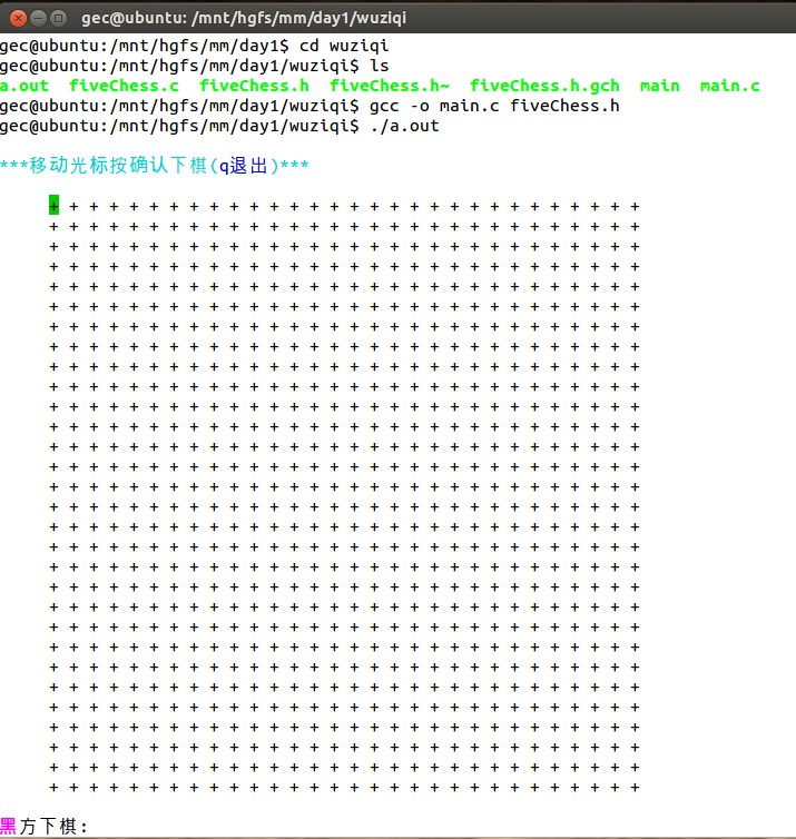 2021-07-15 在VMware(ubuntu)上下五子棋 #include <stdio.h>#include <stdlib.h>#include <unistd.h>#include "fiveChess.h"/* * 函数名: initGame() * 功能描述: 对游戏数据进行初始化 * 参数: 游戏界面数据 * 返回值: 无*/void initGame(int data[ROW][COL]){ int i, j; printf("\033[2J"); /* 清屏 .