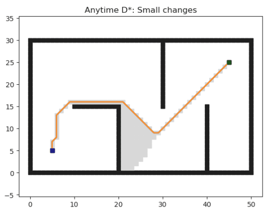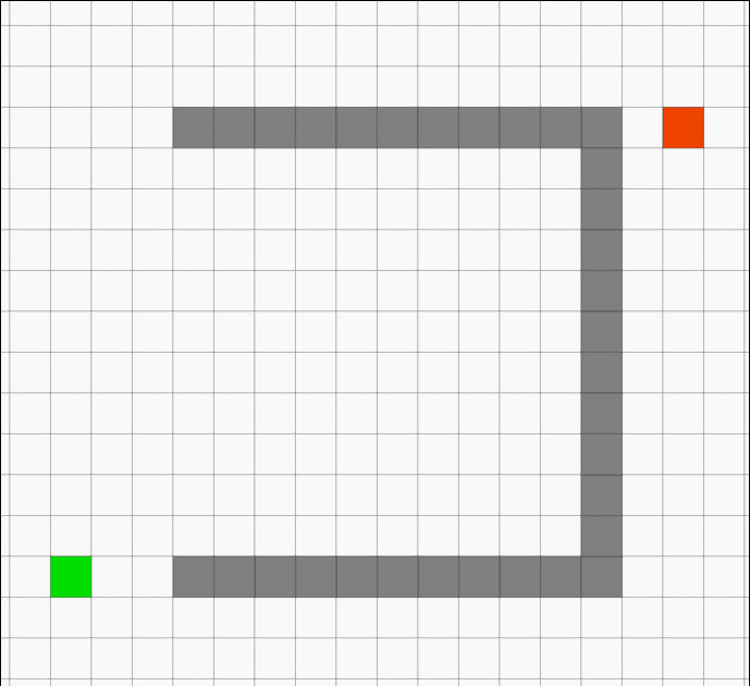 但是当有障碍物的时候。对于Dijkstra算法而言,运行得较慢,但确实能保证找到一条最短路径: