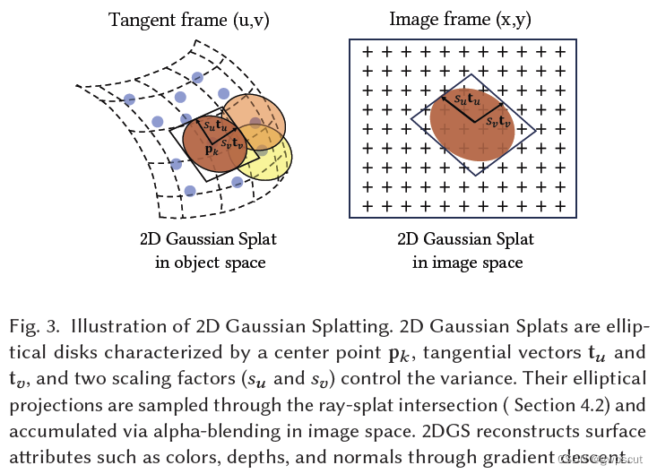 2DGS采用了扁平的基元(planar disk)对场景进行表示,2DGS的基元辐射场垂直于其法线(the normal as the direction of steepest change of density),使其可以更好地贴合场景表面。也有其他类似的工作采用2D 高斯来做几何重建,但是需要稠密的点云以及真值法向量作为输入,但是本文只需要colmap或sfm得到的稀疏点以及作为supervision的图片。