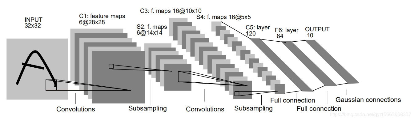 它的输入图像为的灰度值图像,后面有三个卷积层和一个全连接层和一个高斯连接层。第一个卷积层C1包含6个卷积核,卷积核尺寸为
