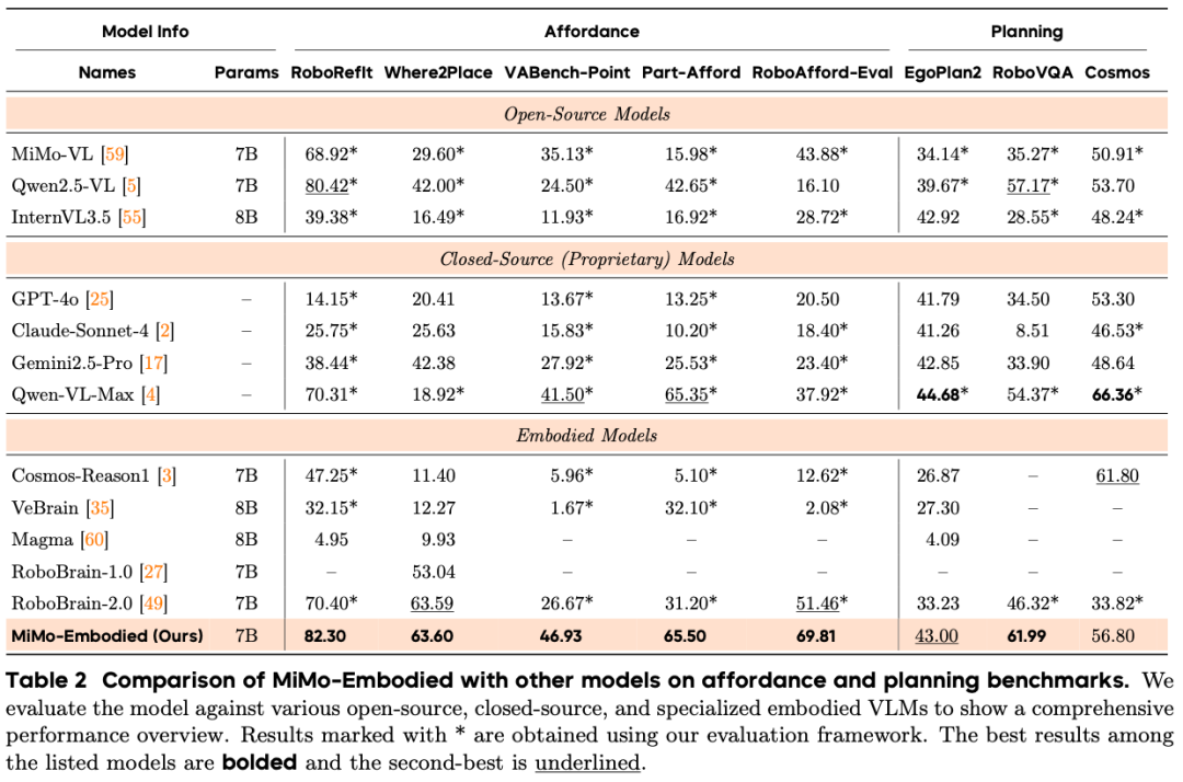在17个具身智能基准测试中,MiMo-Embodied 在可供性预测(Affordance Prediction)、任务规划(Task Planning)和空间理解(Spatial Understanding)三大核心能力上全面刷新记录。