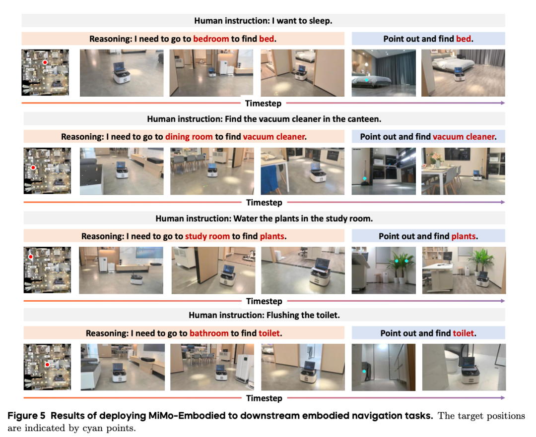 团队在具身导航和操作两个基础下游应用中验证了模型的实用性。在导航任务中,MiMo-Embodied 在四个家庭导航场景中表现优异:定位卧室中的床、在餐厅找到吸尘器、在书房识别植物、在浴室定位马桶。