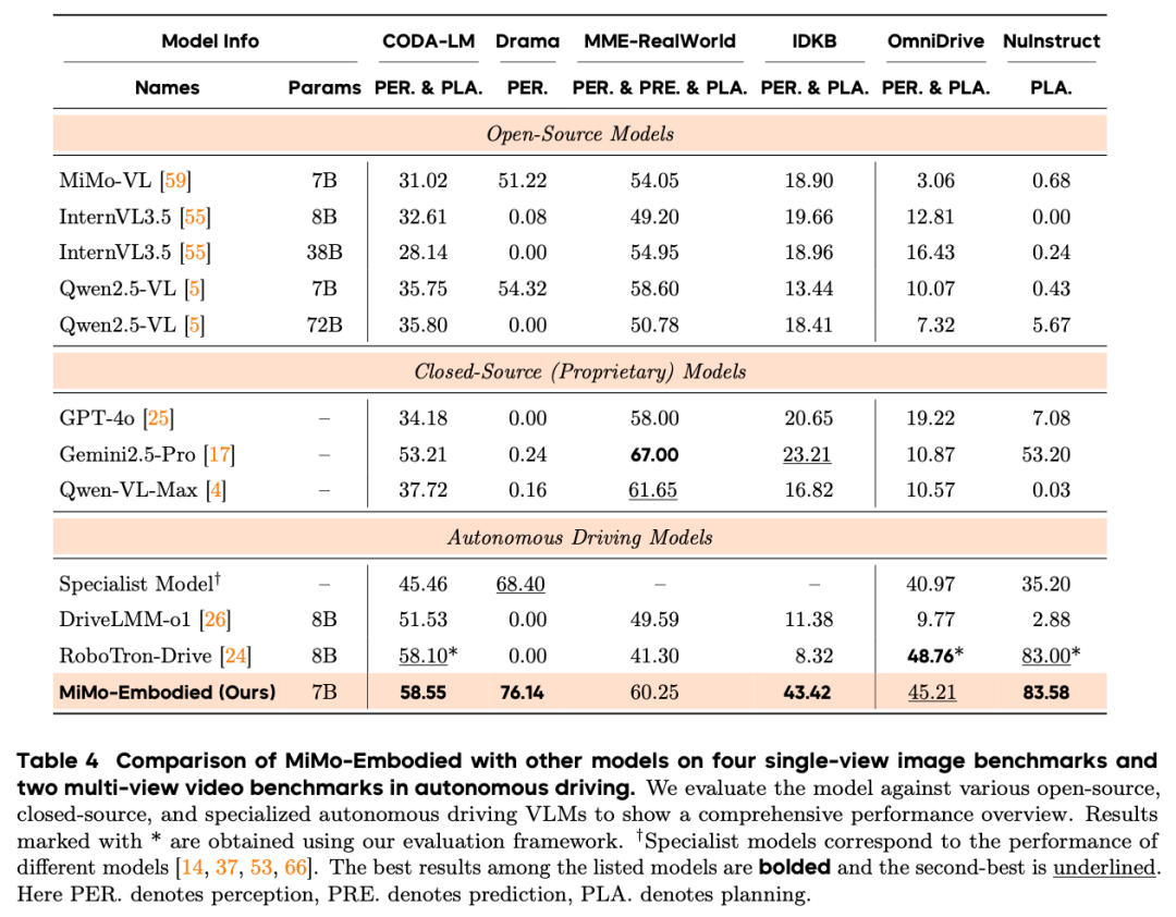 MiMo-Embodied 在12个自动驾驶基准上表现卓越,涵盖环境感知、状态预测和驾驶规划三大维度。