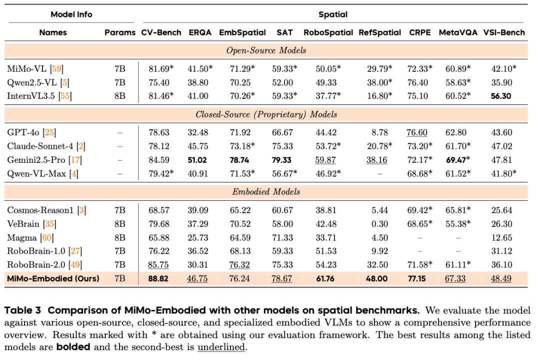 研究数据显示,MiMo-Embodied 在17个具身智能基准和12个自动驾驶基准上均刷新了记录(SOTA),不仅大幅超越了开源基线,更在空间推理与规划等关键指标上击败了 GPT-4o、Gemini-Pro 等闭源模型,证明了跨域知识融合的巨大潜力。