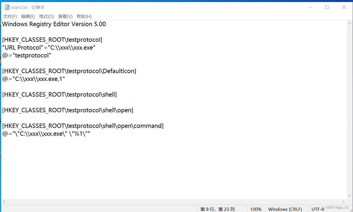 其中testprotocol为协议名称,可自定义。C:\\xxx\\xxx.exe为你的程序路径,需要你自行定义。