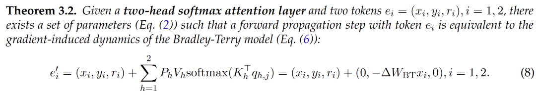 作者证明了多层transformer(包含3-head softmax attention和relu激活函数的FFN)可以利用自我纠错样本生成更优奖励的回答。具体而言,作者证明了存在模型权重,使得transformer可以通过在前向传播的过程中执行对其内部奖励模型参数的梯度下降,来生成更符合对齐目标的更优回答。
