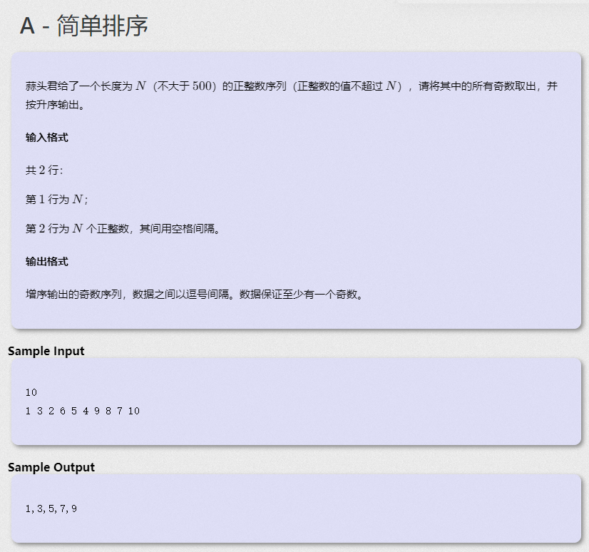 C语言简单排序 题目描述:蒜头君给了一个长度为NN(不大于500500)的正整数序列(正整数的值不超过NN),请将其中的所有奇数取出,并按升序输出。输入格式共2行:第1 行为N;第2行为N个正整数,其间用空格间隔。输出格式增序输出的奇数序列,数据之间以逗号间隔。数据保证至少有一个奇数。输入样例:101 3 2 6 5 4 9 8 7 10输出样例:1,3,5,7,9解题思路:先将所有的数存入数组a,再将其中的奇数存入数组b,最后将数组b排序,升序输出...