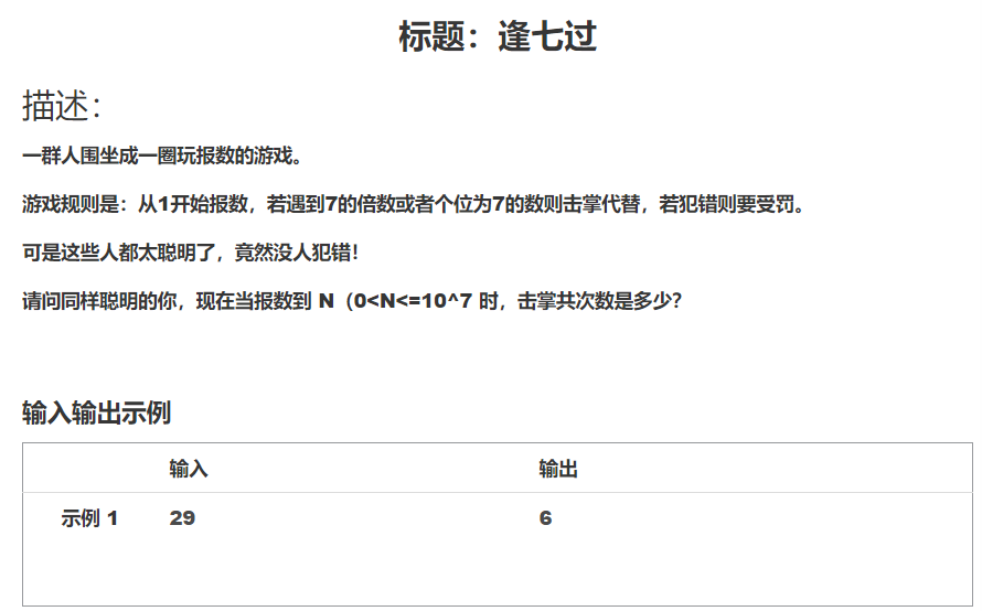 C语言逢七过 题目描述:一群人围坐成一圈玩报数的游戏。游戏规则是:从1开始报数,若遇到七的倍数或者个位为7的数则击掌代替,若犯错则要受罚。可是这些人太聪明了,竟然没人犯错!请问同样聪明的你,现在当报数到N(0<n<=10^7)时,击掌次数共是多少?输入输出示例:输入:29#include <stdio.h>int main(){ int i,n;//定义变量 int sum=0; scanf("%d",&n);//输入正整数n
