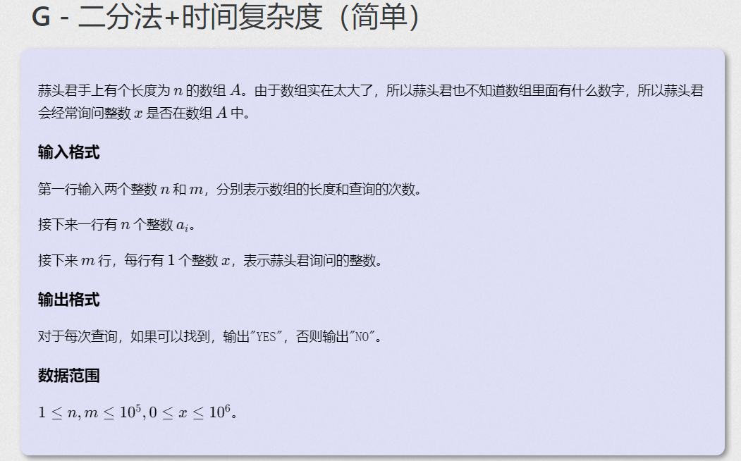 C语言二分法+时间复杂度(简单) 题目描述:蒜头君手上有个长度为n的数组A。由于数组实在太大了,所以蒜头君也不知道数组里面有什么数字,所以蒜头君会经常询问整数x是否在数组A中。输入格式:第一行输入两个整数n 和m,分别表示数组的长度和查询的次数。接下来一行有n个整数ai。接下来m行,每行有1个整数x,表示蒜头君询问的整数。输出格式:对于每次查询,如果可以找到,输出"YES",否则输出"NO"。数据范围:1≤n,m≤10^5,0≤x≤10^6。输入样例:10 5...