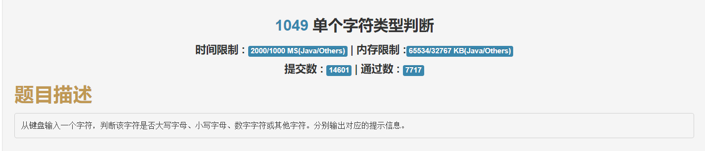 C语言单个字符类型判断 题目描述从键盘输入一个字符,判断该字符是否大写字母、小写字母、数字字符或其他字符。分别输出对应的提示信息。输入要求输入一个字符。输出要求如果该字符是大写字母,则输出“upper”;若是小写字母,则输出“lower”;若是数字字符,则输出“digit”;若是其他字符,则输出“other”。(输出不含双引号)。输入样例1输出样例digit#include<stdio.h>int main(){ char ch; scanf(